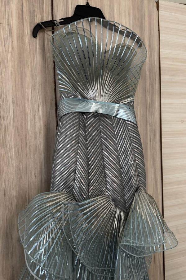 Description: A stunning Amit Aggarwal metallic sculpted gown featuring a structured strapless bodice, signature polymer detailing, and a dramatic tiered silhouette in shimmering icy blue.