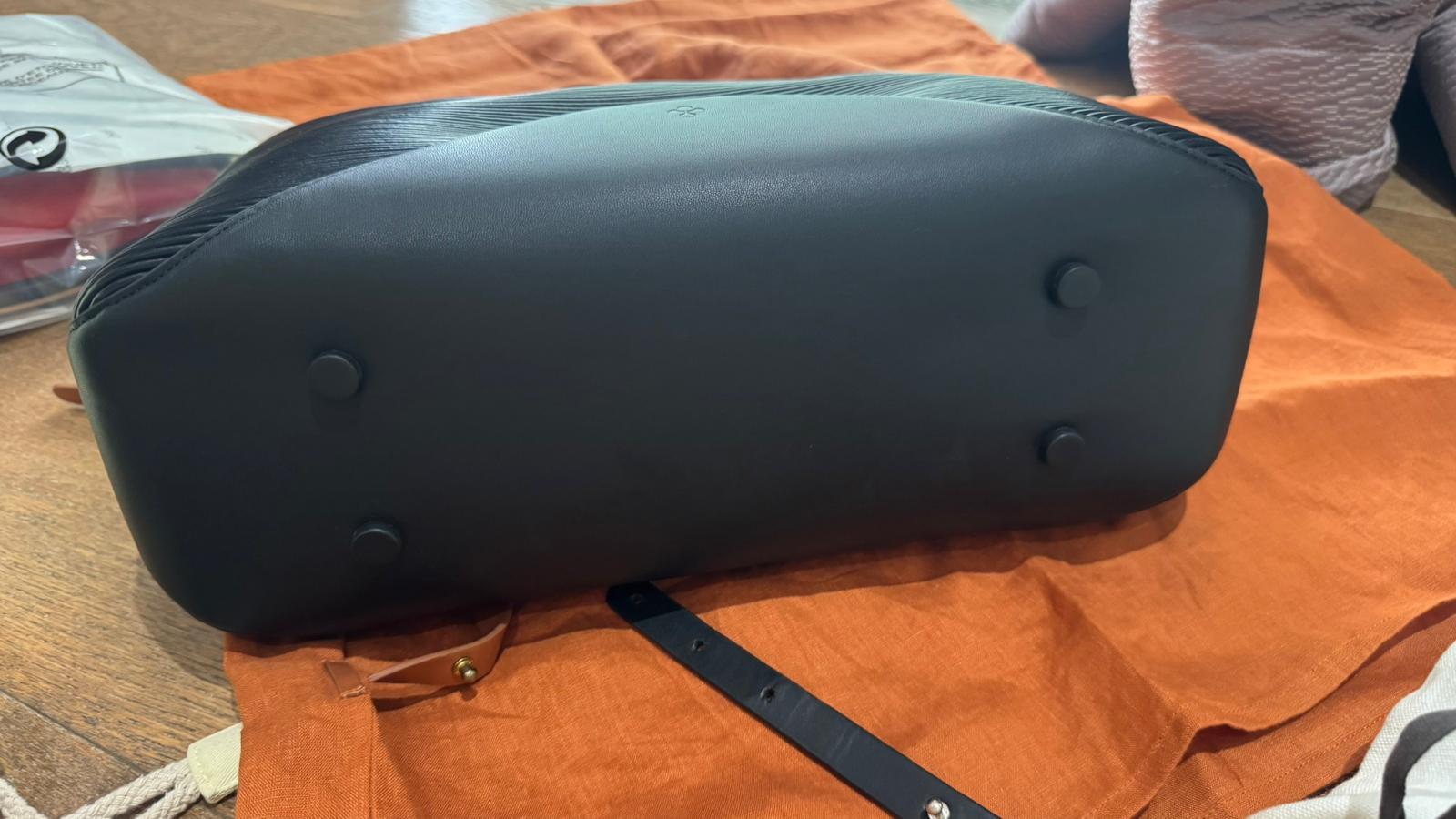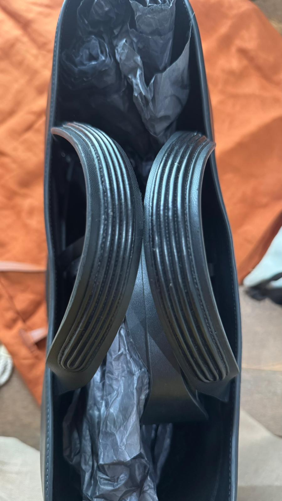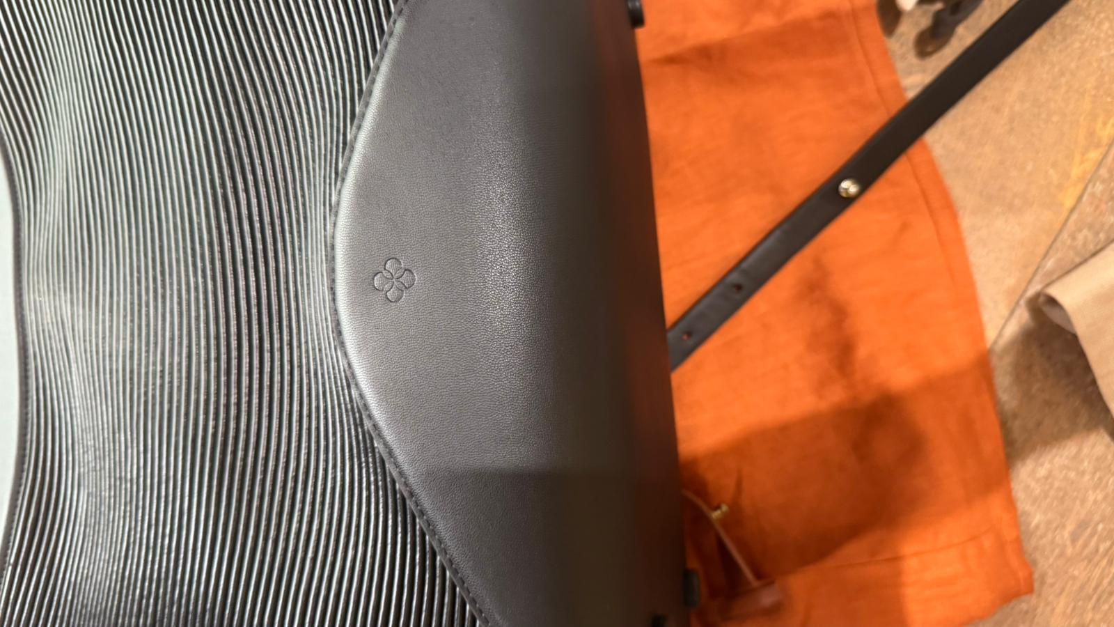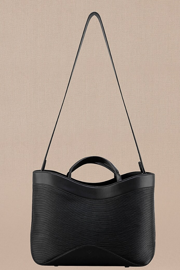 Description: A modern AMPM bag crafted in textured black leather, featuring a sculptural silhouette with fluid wave detailing. Designed with a structured top handle and a sleek shoulder strap, this versatile piece blends contemporary elegance with everyday functionality—perfect for both work and elevated casual looks.