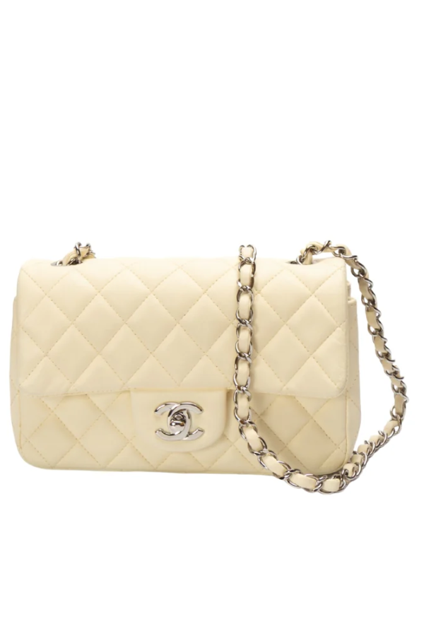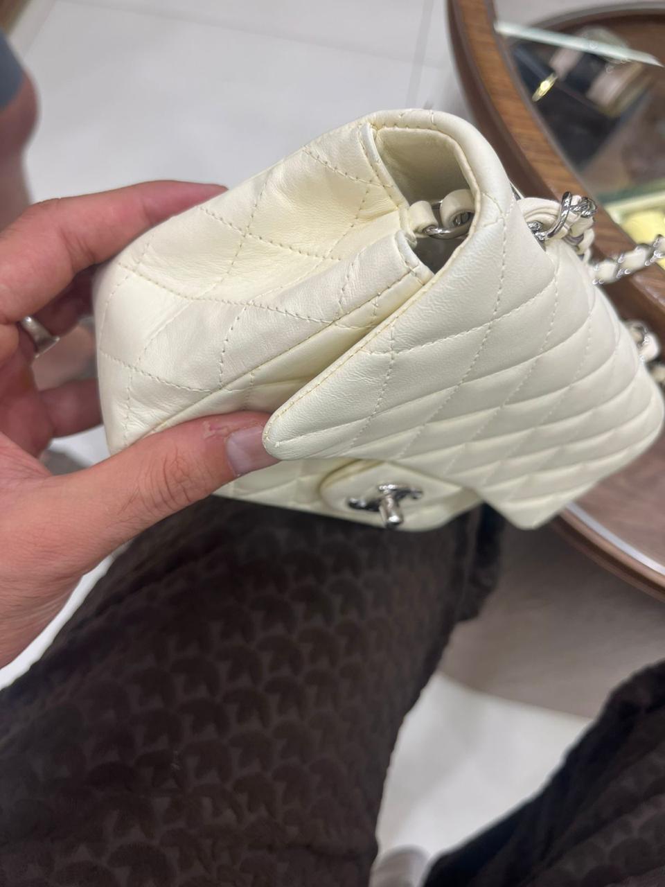 Description: A timeless Chanel Classic Mini Square Flap Bag crafted in elegant white quilted leather, featuring the iconic CC turn-lock closure and a delicate leather-interwoven chain strap. Chic, compact, and perfect for elevating both day and evening looks.