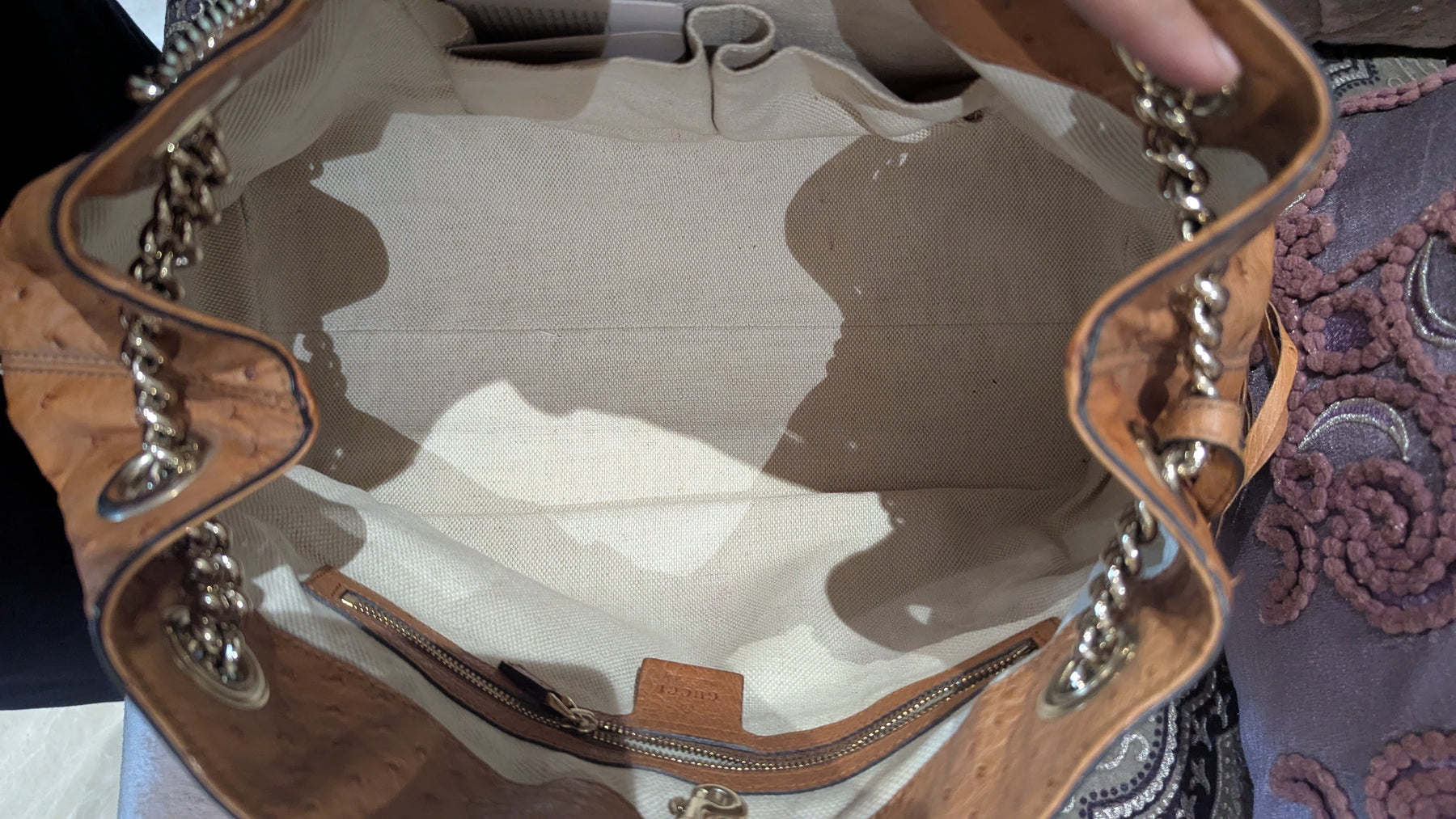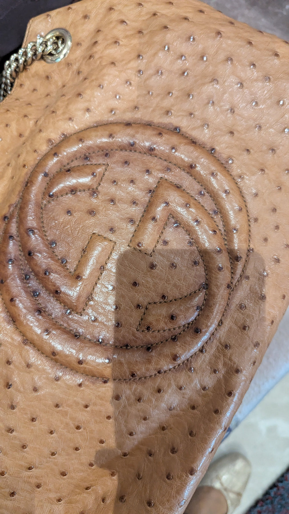 Description: A timeless luxury statement crafted in genuine ostrich leather, featuring Gucci’s iconic embossed Soho logo. Designed with elegant gold-tone chain straps and a spacious interior, this bag blends sophistication with everyday versatility. Perfect for elevating both casual and evening looks.