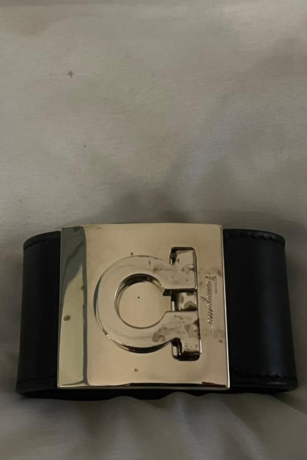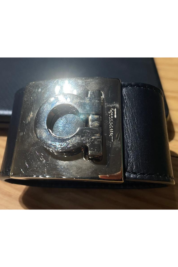 Description: This elegant Salvatore Ferragamo Gancini cuff bracelet features a sleek black leather band accentuated by the brand’s signature gold-tone Gancini logo clasp. A timeless piece that blends sophistication and modern design, it adds a refined statement to any outfit — perfect for both casual and formal wear.