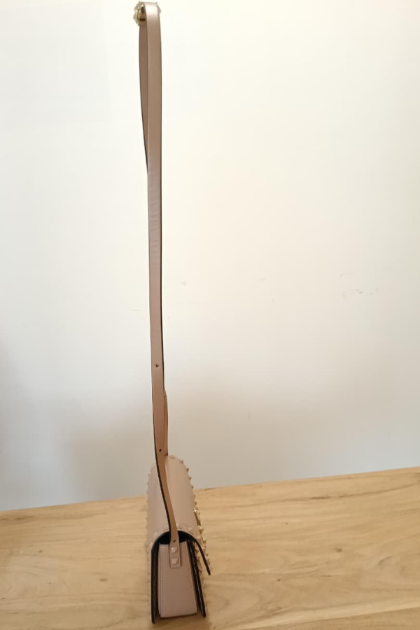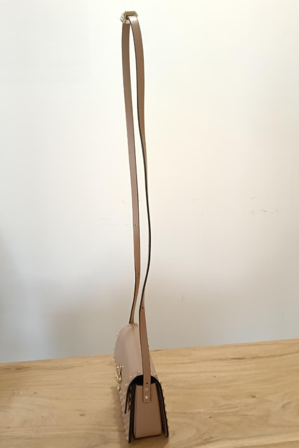 Description: Valentino Garavani Rockstud Crossbody Bag — crafted in smooth nude leather, accented with signature pyramid studs and gold-tone hardware. The structured silhouette and adjustable strap make it a timeless blend of edge and elegance, perfect for day-to-night styling.