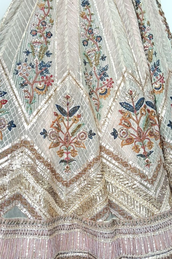Work Type: Embroidery, Zardozi , Handwork, incorporating metallic threads and colorful accents in floral