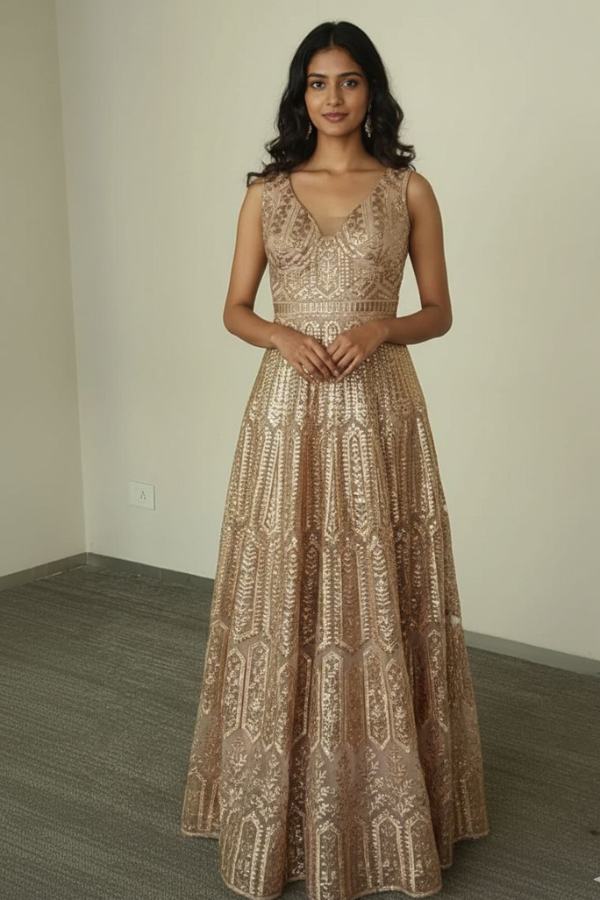 Description: A sleek, columnar gown in brilliant gold sequins, designed for maximum impact under the lights. Its minimalist cut and neckline create an aura of modern, powerful elegance.