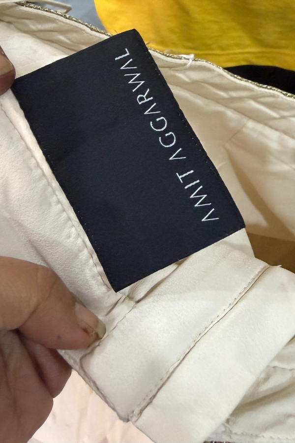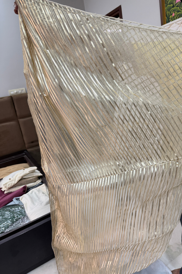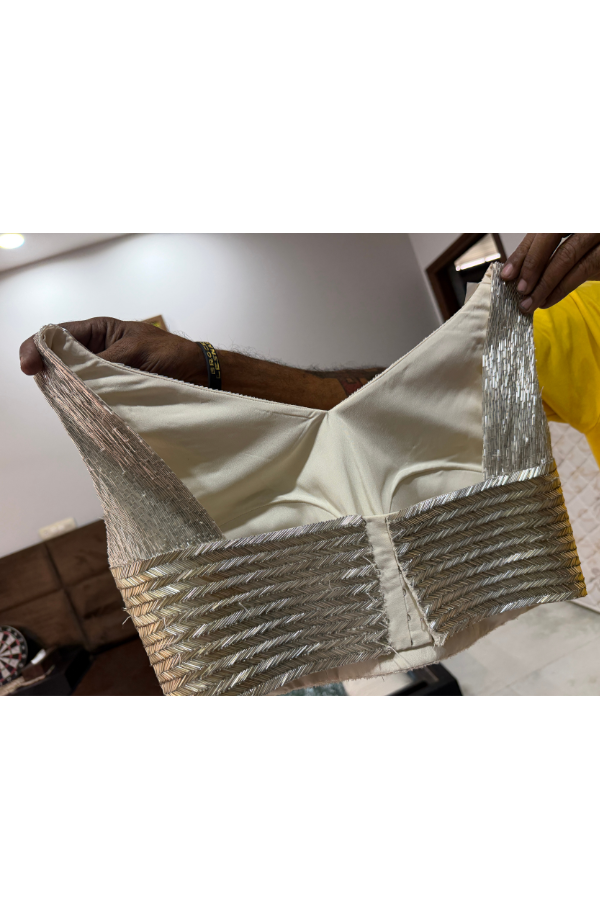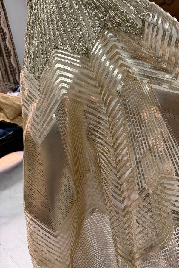Description: A striking gold metallic lehenga with signature sculpted detailing, precision pleating, and a futuristic sheen. Paired with a bold blouse and sheer metallic drape, this set delivers modern glamour and statement couture—perfect for cocktails, receptions, and high-impact celebrations.
