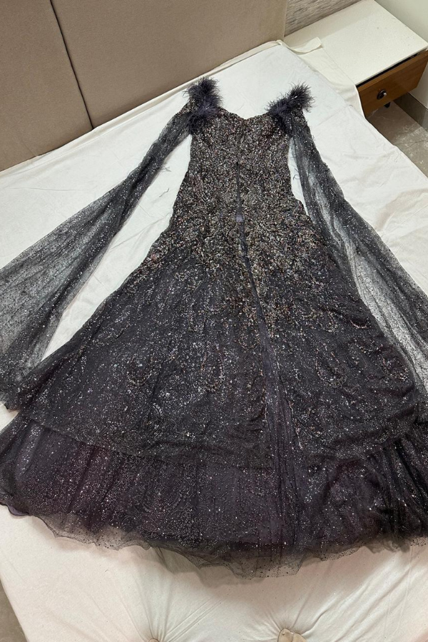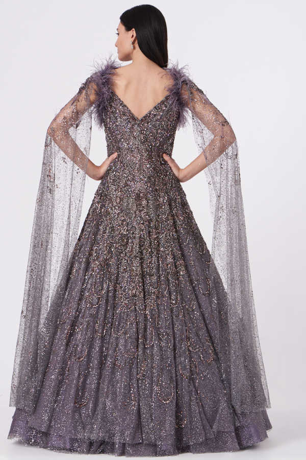 Description: Featuring a blue jacket in shimmer tulle base with draped sleeves and feather embellishments. It is paired with a matching lehenga