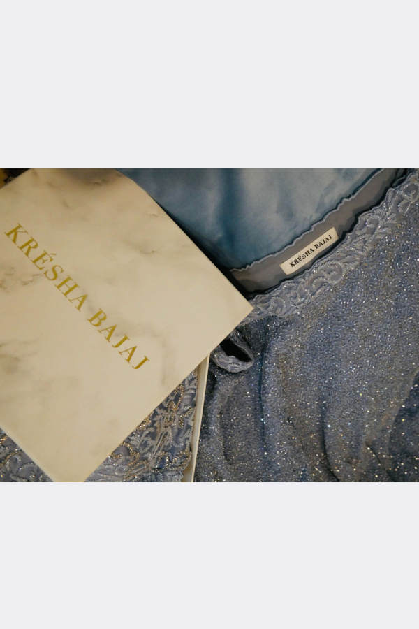 Description: Powder blue Kresha Bajaj lehenga set featuring an intricately embroidered blouse with fringe detailing, paired with a shimmer-dusted skirt for a glamorous, modern bridal look.