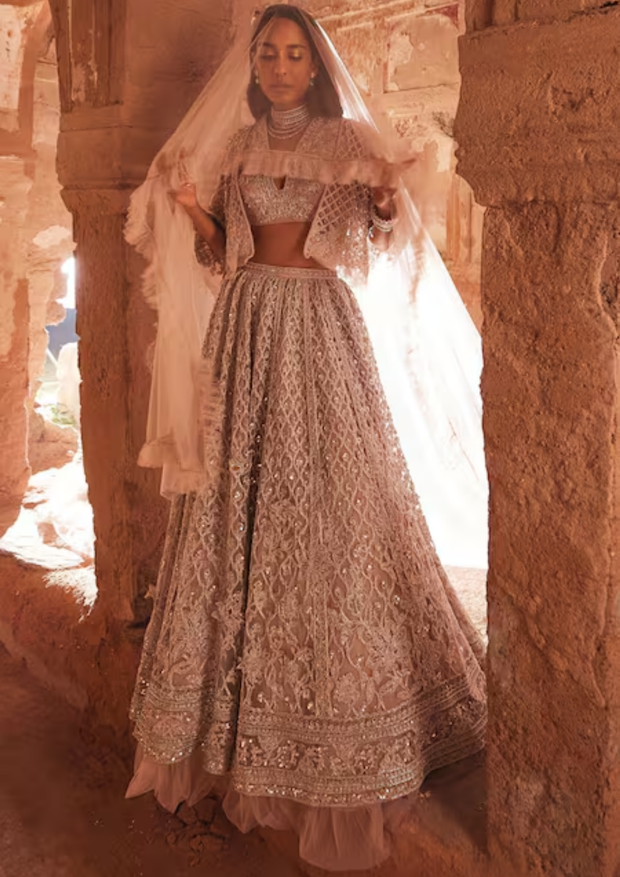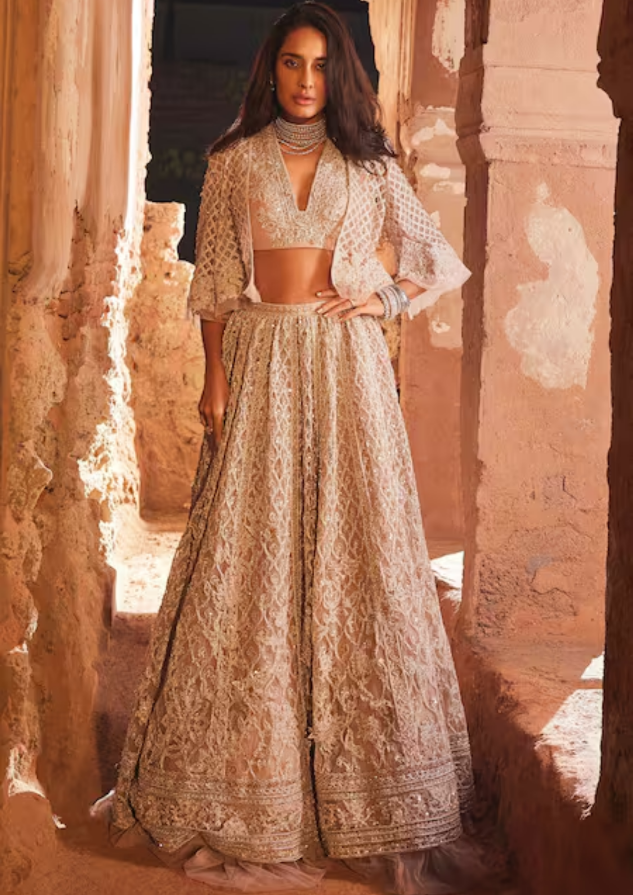Description: A breathtaking peach embroidered lehenga set featuring intricate thread and sequin work. Paired with a plunging neckline blouse and a sheer embroidered jacket, this ensemble exudes regal elegance with a modern twist—perfect for a contemporary bride or festive occasion.