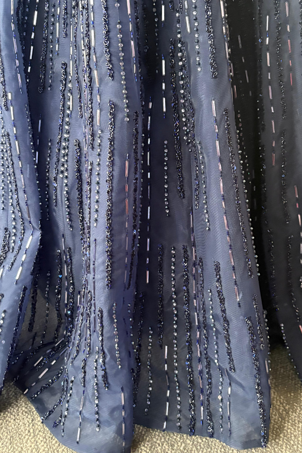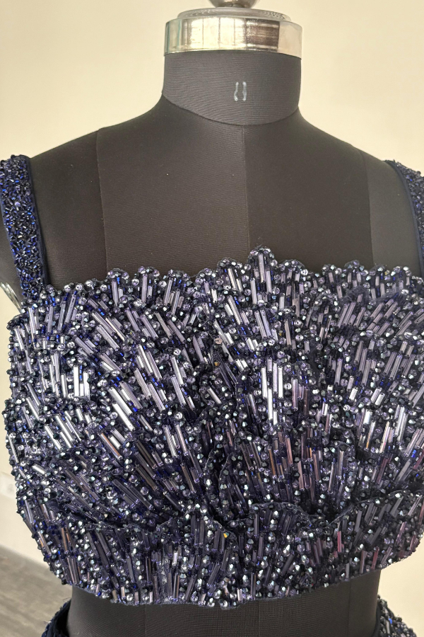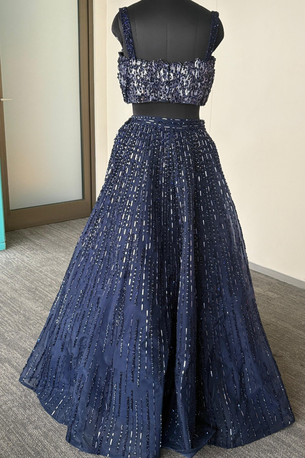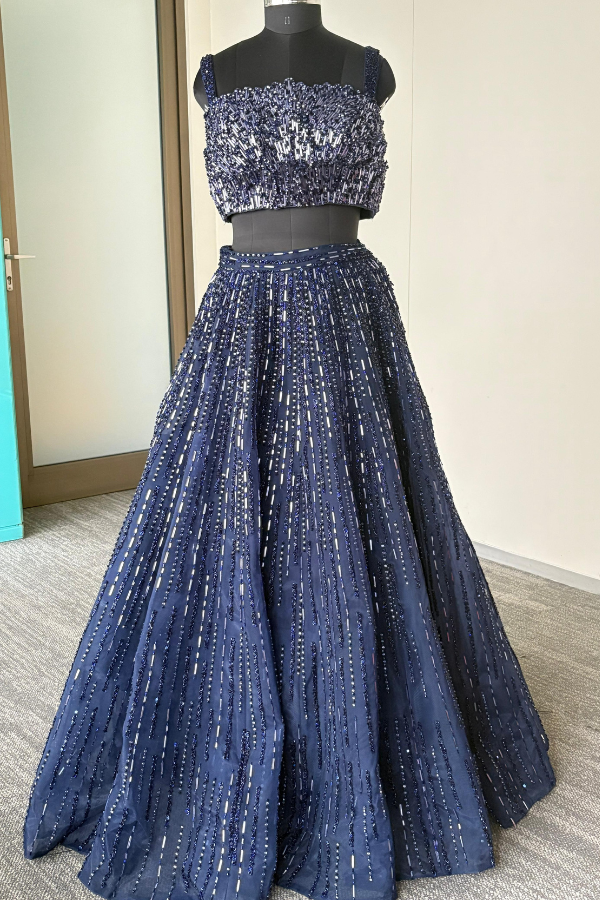 Description: Navy blue lehenga featuring all-over embroidery in a stripe pattern and attached can-can. Paired with a strapless padded blouse and sheer dupatta with mirror embroidered border.