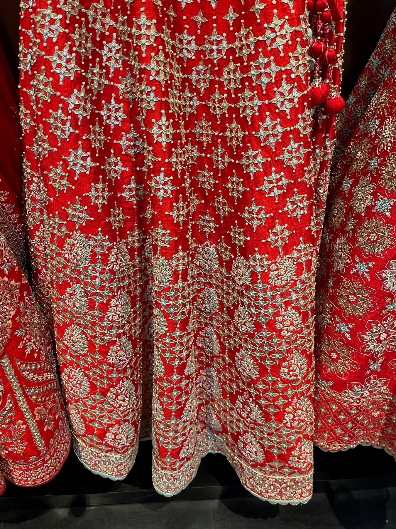 Description: A classic Anita Dongre red lehenga adorned with intricate mirrorwork and delicate embroidery, paired with a matching blouse and dupatta — a timeless bridal-ready ensemble perfect for weddings and festive celebrations.