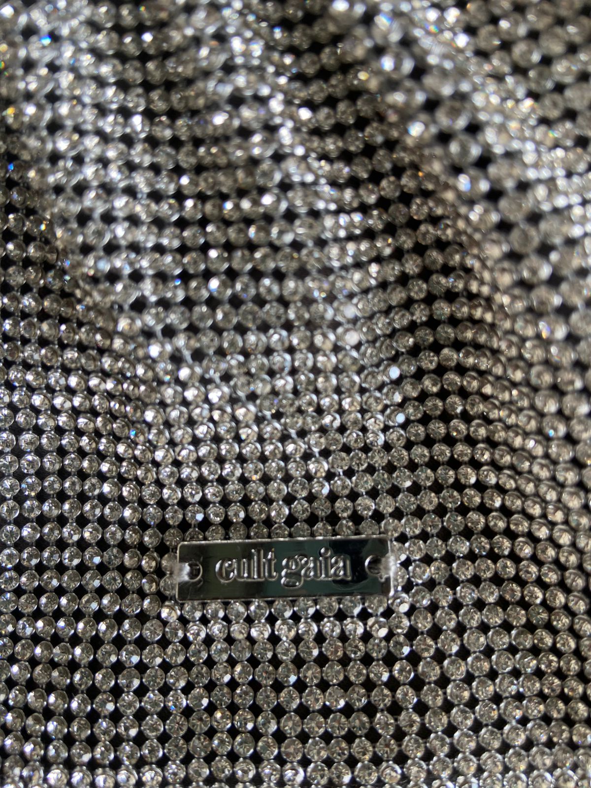 Description: The Cult Gaia Bara Mini Bag in shimmering silver mesh, featuring a soft ruched silhouette and signature knotted handle — a chic statement accessory perfect for evenings, parties, and special occasions.