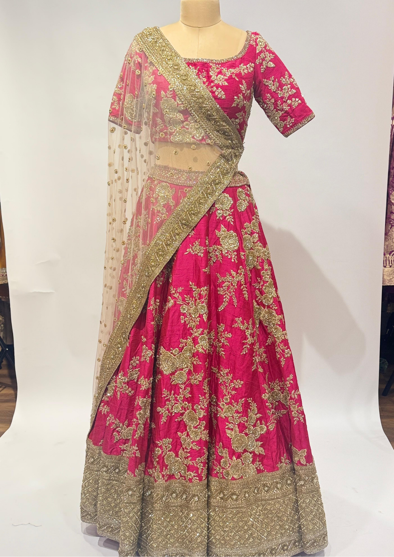 A timeless Sabyasachi lehenga in a striking hot pink hue, intricately hand-embroidered with antique gold zardozi floral motifs. The set features a heavily embellished blouse with a square neckline, paired with a matching voluminous skirt and a sheer net dupatta adorned with sequin floral bootis and a statement border. Perfect for weddings, receptions, or high-glam festivities, this ensemble combines regal craftsmanship with modern elegance.