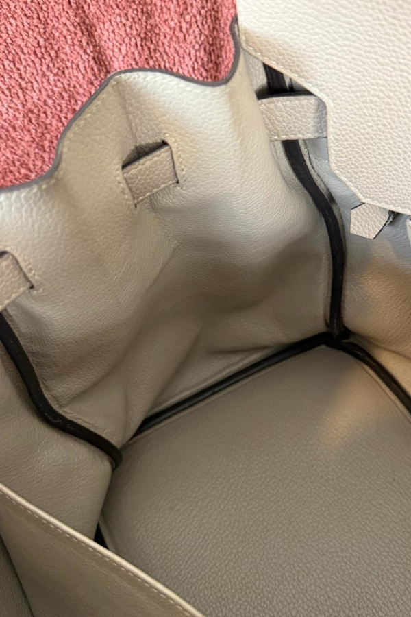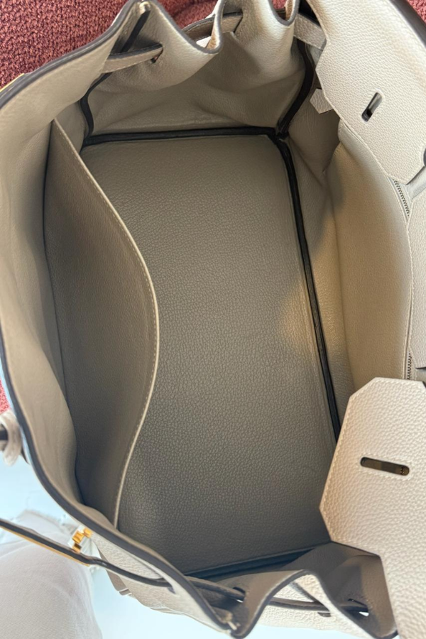 Description: This iconic Hermès Birkin 35 is crafted in luxurious Gris Tourterelle Togo leather, known for its soft yet durable grain texture. The bag features palladium-plated hardware, including the signature turn-lock closure, protective metal feet, and padlock detail. A timeless statement of elegance and craftsmanship, it’s designed for both sophistication and everyday luxury.