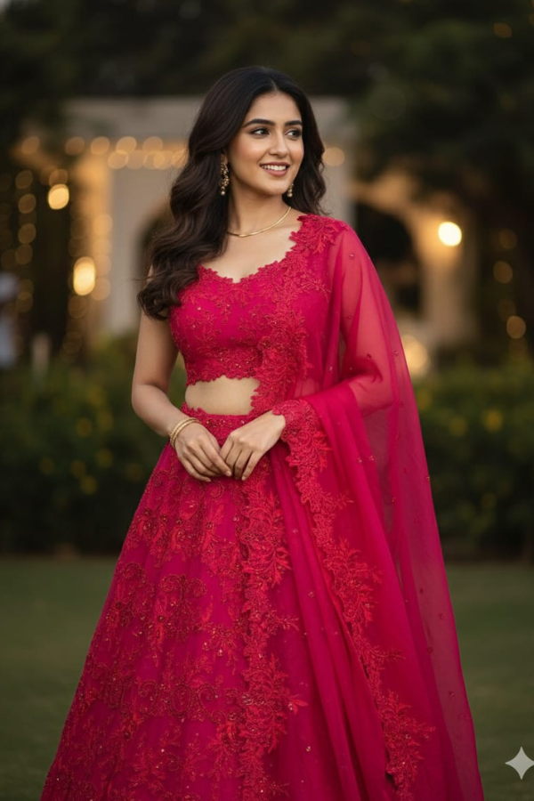 Measurements: Blouse length - 14 inch, Lehenga length - 43 inch, neck depth - 9, Chest - 33.5, waist - 27