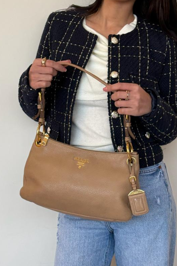 Description: A chic and timeless Prada shoulder bag in beige textured leather, featuring gold-tone hardware and a zip closure. Compact yet elegant, perfect for daily use or special occasions. Minor signs of usage.