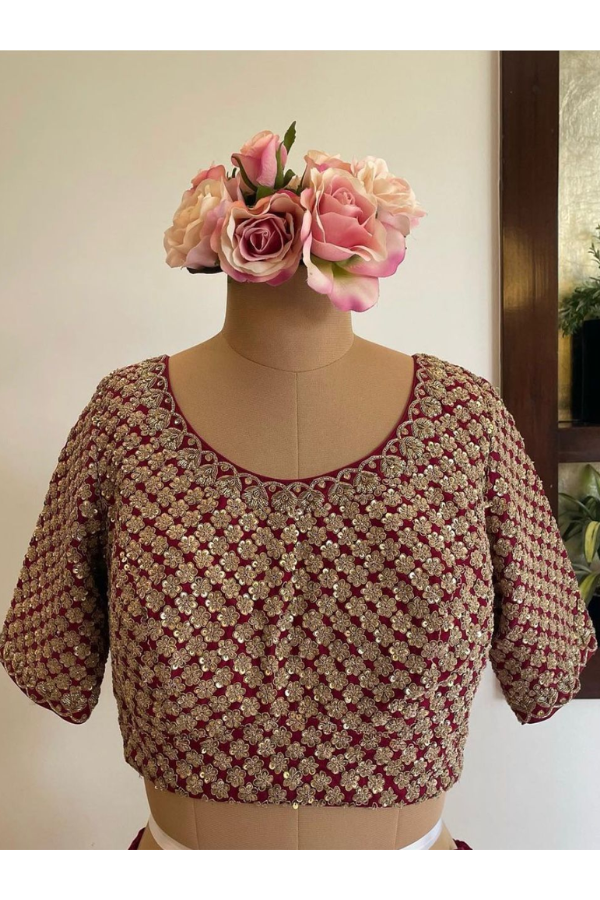 Description: A regal maroon velvet lehenga adorned with intricate gold embroidery, paired with an embellished blouse and a peach net dupatta featuring delicate sequin work and ornate borders.
