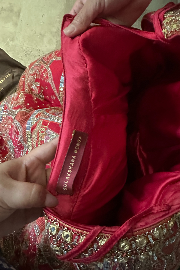 Description: A regal Sulakshana Monga lehenga set, intricately handcrafted with detailed embroidery, mirror work, and temple motifs. Paired with a structured blouse, embellished belt, and a sheer dupatta, this masterpiece exudes grandeur and divine elegance, perfect for bridal and ceremonial occasions.