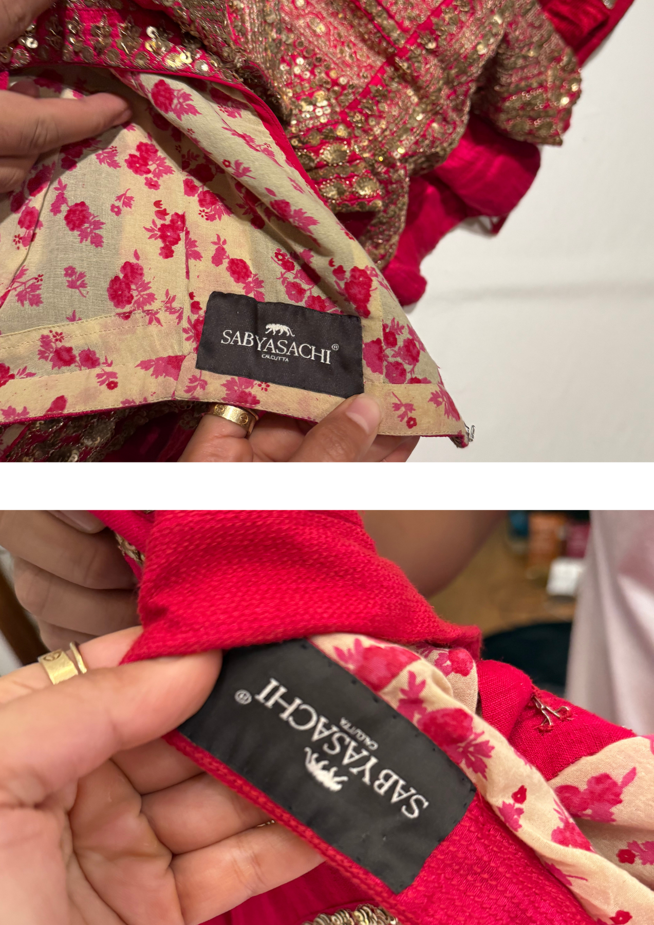 Description: A regal red bridal lehenga by Sabyasachi, featuring exquisite zardosi and sequin embroidery in antique gold, paired with a richly embellished blouse and dual dupattas in green and red. The lehenga is further enhanced with intricate gota and mirror detailing, lending a grand traditional touch. Complete with a matching potli, this ensemble is perfect for brides seeking timeless elegance with cultural richness.
