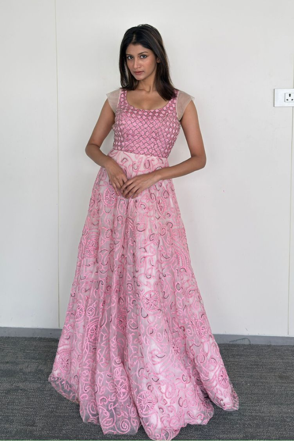 Description: Blush pink Jade gown featuring an intricately hand-embroidered bodice with a sheer shoulder detail and a flared skirt adorned with delicate threadwork and motifs, creating a graceful and feminine silhouette.