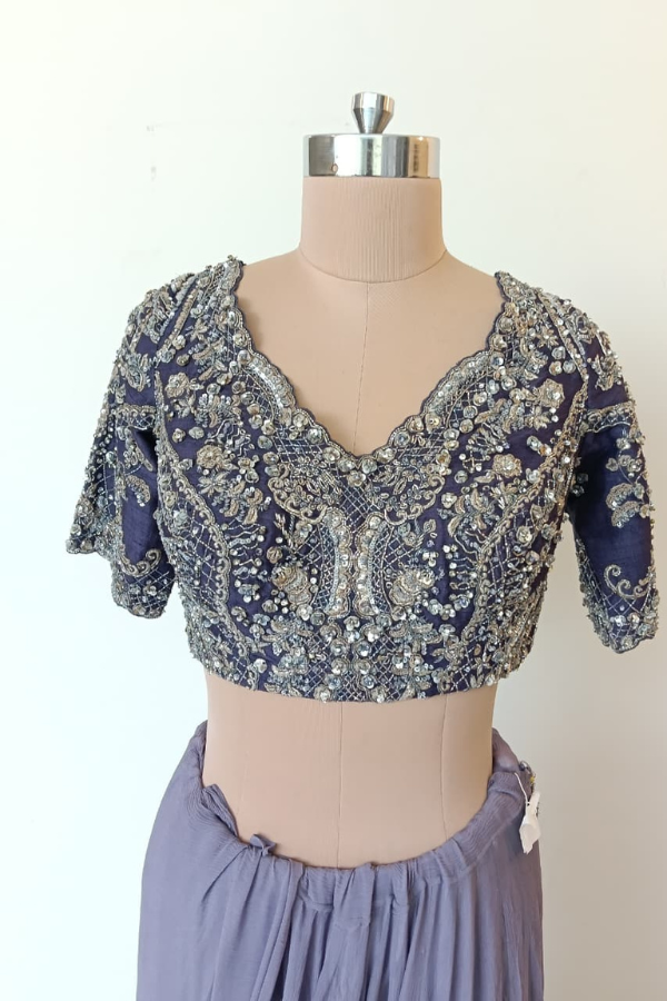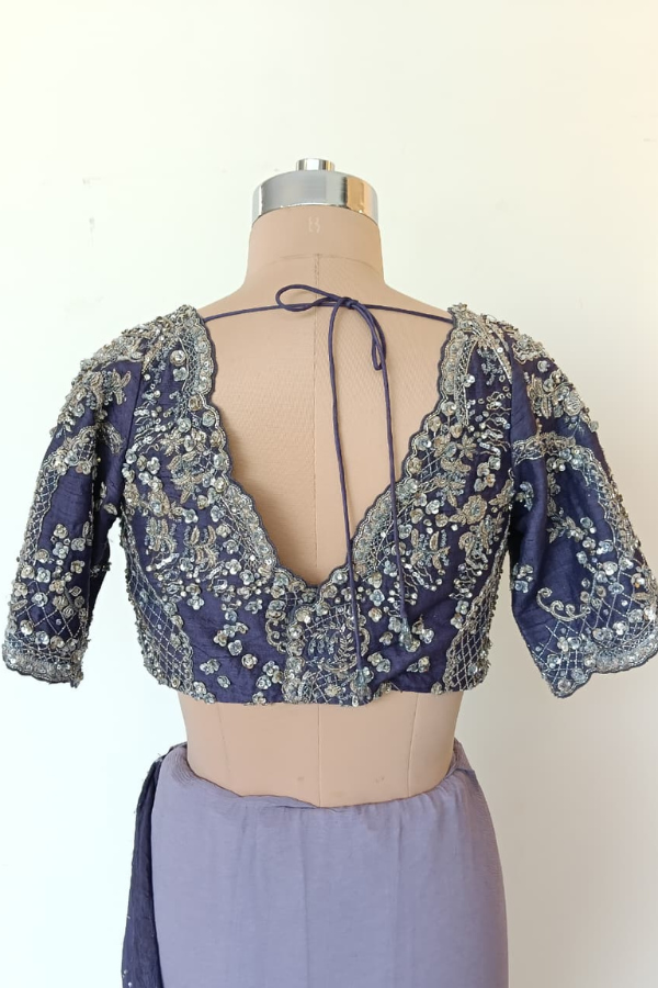 Description: An exquisite ombré saree in shades of lavender and deep purple, beautifully adorned with intricate silver embroidery and sequins. Paired with a heavily embellished blouse, this ensemble exudes timeless sophistication and refined glamour — perfect for evening occasions or festive celebrations.
