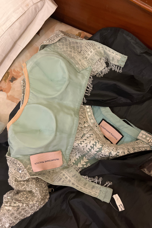 Description: Falguni & Shane Peacock lehenga featuring intricate threadwork and sequin embroidery all over, paired with a matching embellished blouse and soft net dupatta with delicate floral detailing. A dreamy, modern yet timeless look perfect for engagement, sangeet or day wedding functions.
