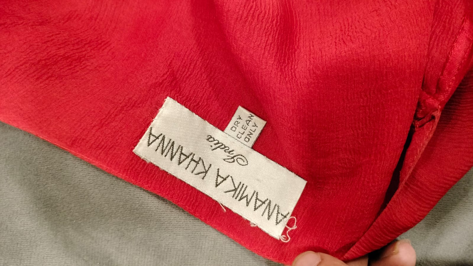 Description: A striking red Anarkali by Anamika Khanna, featuring a wrap-style bodice with a flattering V-neckline and tie detail at the waist. The full-length sleeves are beautifully embellished with intricate tonal embroidery, adding texture and elegance to this flowy, timeless silhouette.