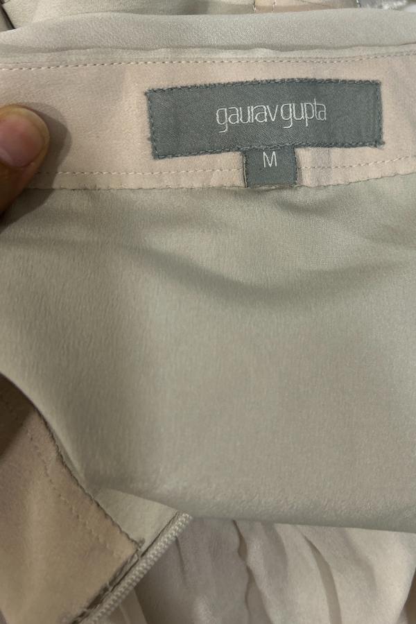 Description: An elegant Gaurav Gupta draped saree gown adorned with intricate sequins and beadwork, featuring a structured bustier and fluid draping that blends tradition with contemporary glamour.