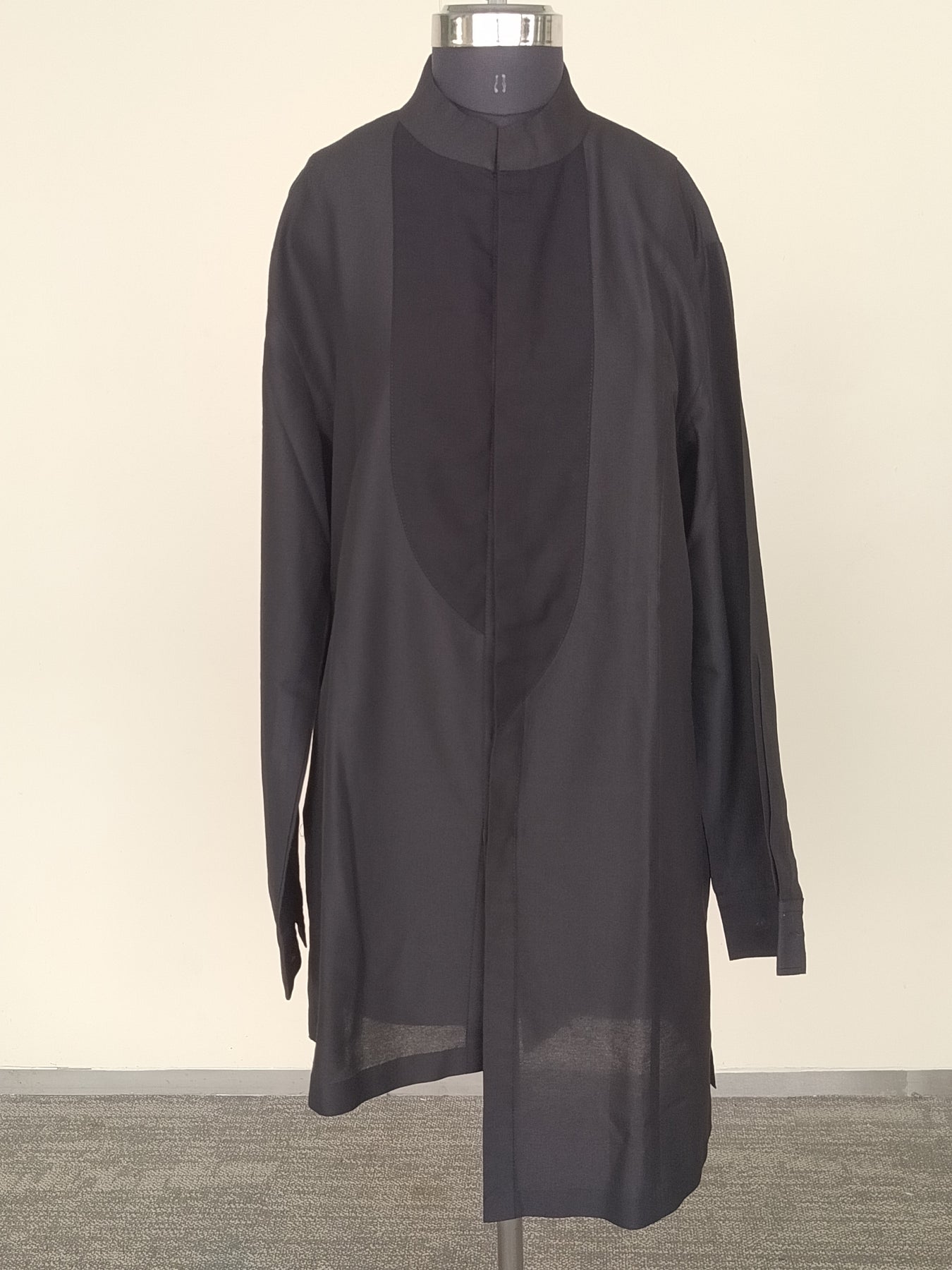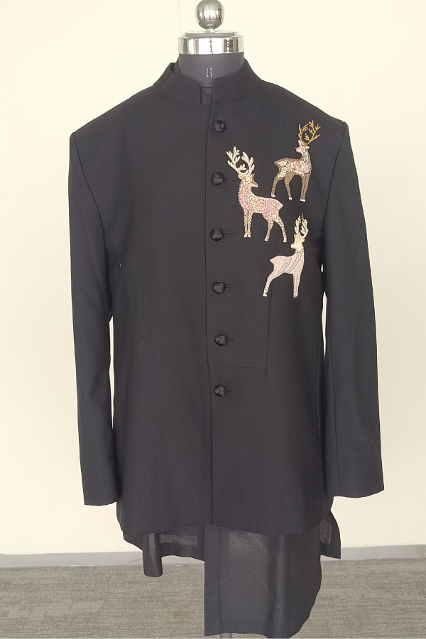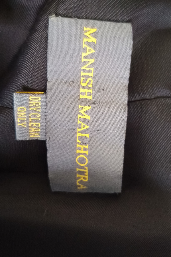 Description: Elegant Manish Malhotra black bandhgala paired with a stylish high-low shirt. Please note: pants are not included with this set.