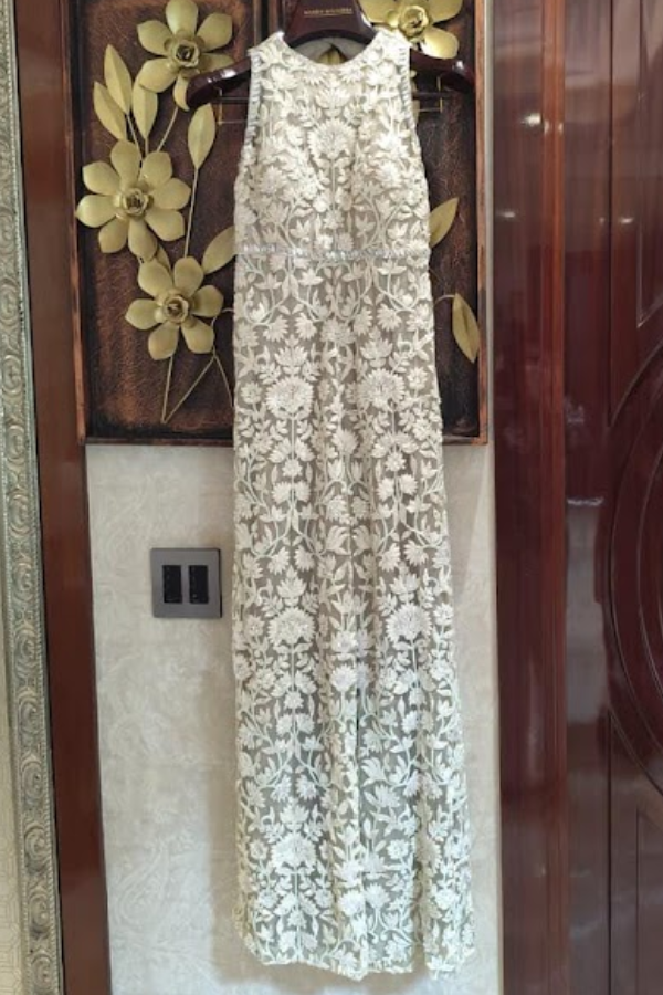 Description: A beautifully embroidered jumpsuit with an elegant high-neck cut and delicate floral threadwork—ideal for cocktails, festive events, or contemporary wedding looks.