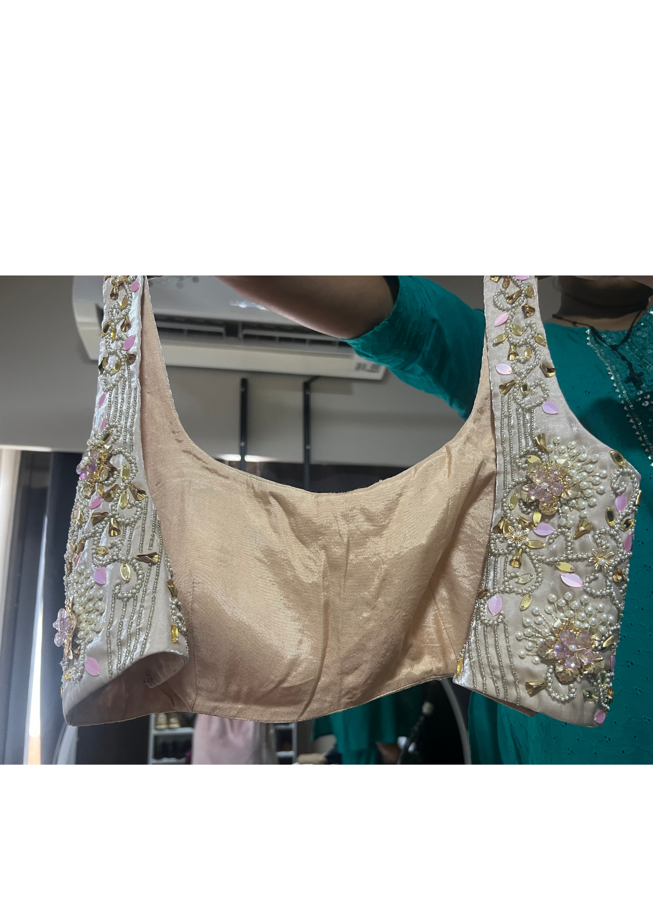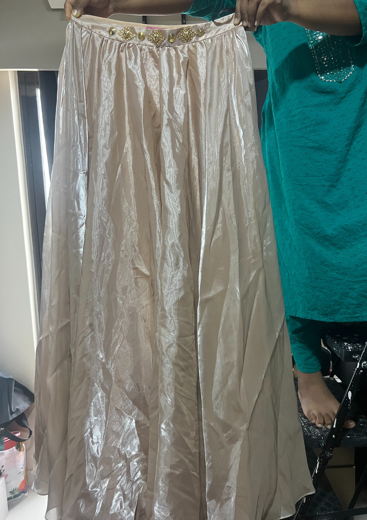 Description: Beige lehenga featuring vintage floral embroidery on the waistband. Paired with a matching padded blouse adorned with beads and sequins, along with an embroidered dupatta with a decorative border.