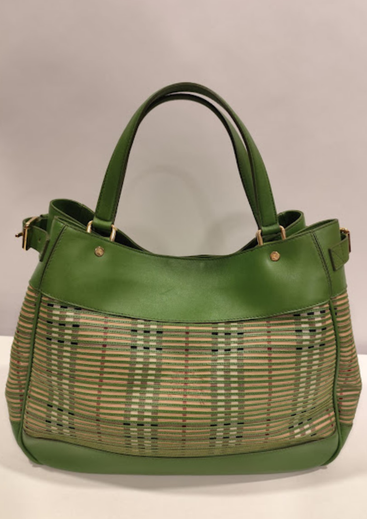 Description: This shoulder bag showcases a canvas body with leather trim, flat handles, and dual shoulder straps, complemented by gold-tone hardware. The interior is lined with canvas and includes multiple pockets for organization. A snap closure at the top secures the contents.