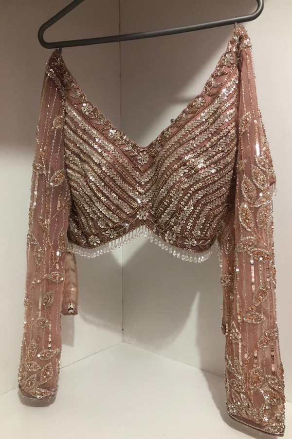 Description: A stunning blush pink lehenga set adorned with intricate sequins, beads, and thread embroidery. The V-neck blouse with full sleeves and delicate tassel detailing adds a touch of modern elegance, while the heavily embellished skirt creates a dreamy, ethereal bridal look perfect for engagement or reception celebrations.