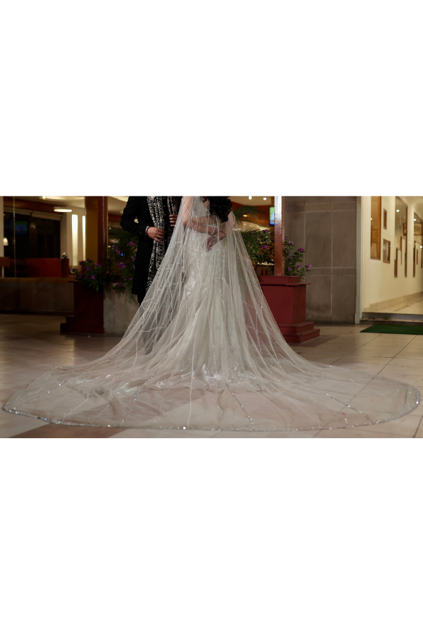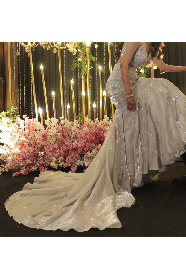 Description: This glamorous lehenga set features a shimmering mermaid-style skirt paired with a fully hand-embroidered blouse and a sheer cape-style dupatta. The intricate silver embellishments and structured silhouette make it a stunning choice for modern brides or evening receptions.