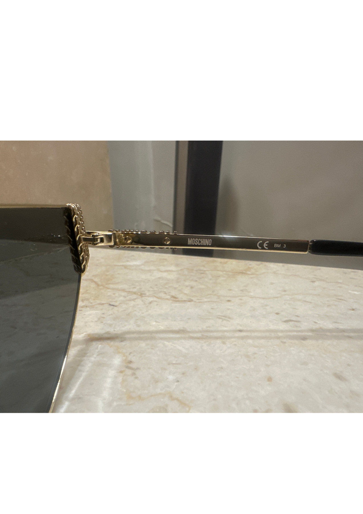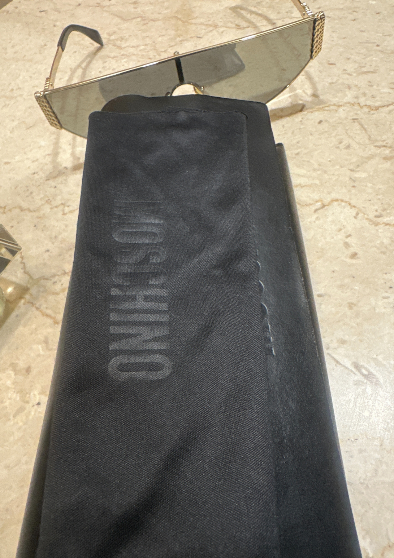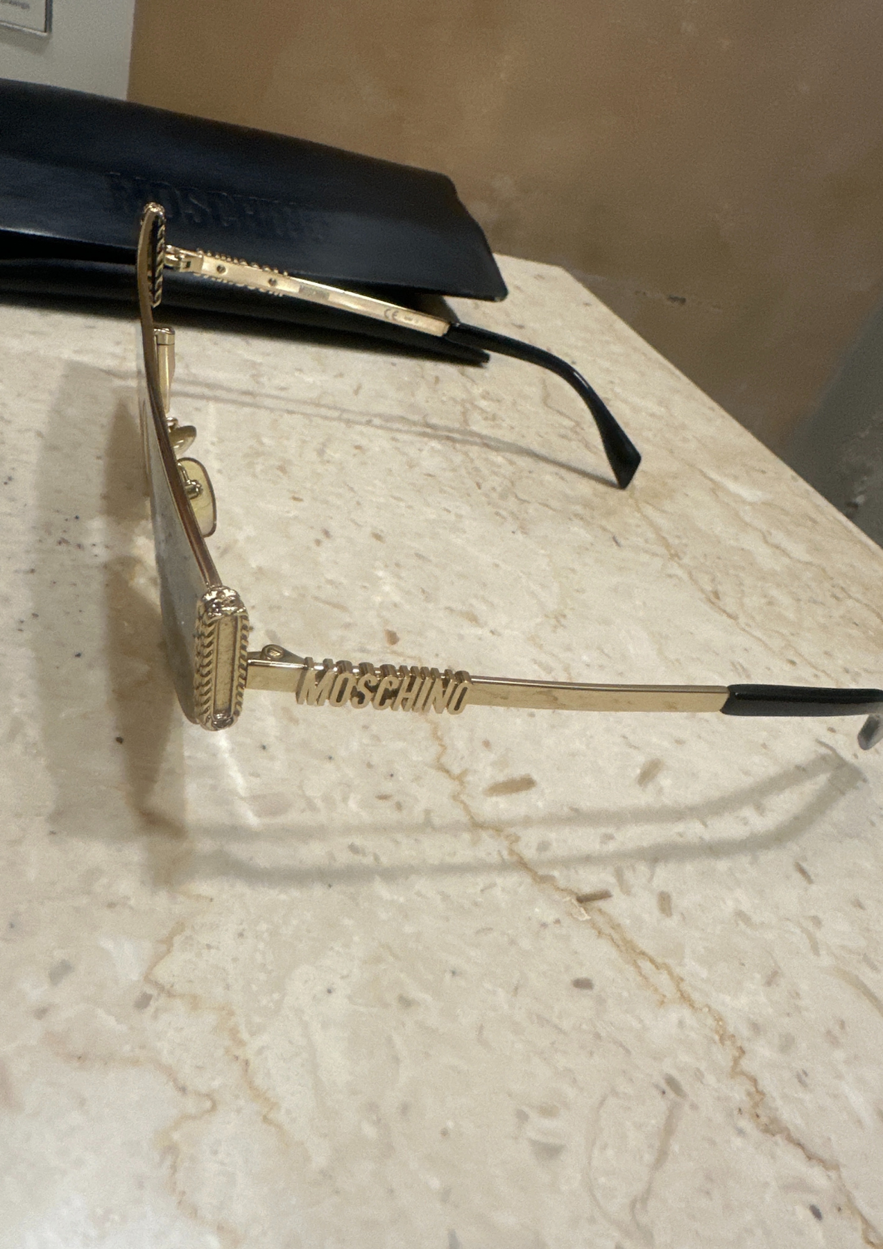 Description: Make a bold statement with these striking Moschino gold-tone shield sunglasses featuring a sleek oversized visor-style lens and signature branding on the temples. Accented with intricate chain-textured corner detailing and black temple tips for comfort, this high-fashion accessory blends luxury with a futuristic edge — perfect for turning heads at day parties, vacations, or glam outings.