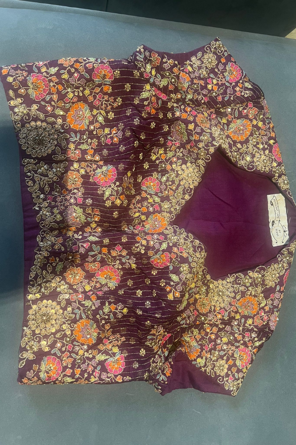 Description: A regal lehenga in rich shades of deep purple and magenta, adorned with intricate zardozi, resham, and sequin work. The traditional Banarasi-inspired motifs and detailed craftsmanship make it a timeless choice for weddings or grand celebrations.