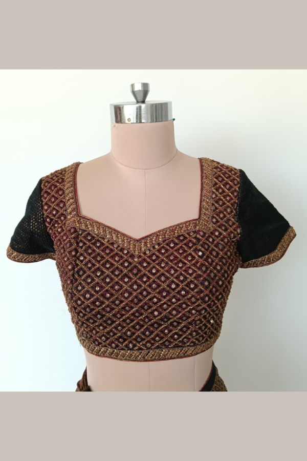 Description: A rich and regal Ritu Kumar saree crafted in deep maroon and black tones, adorned with intricate traditional embroidery and antique gold detailing. The heavy border and ornate motifs bring a classic, heritage charm, making it a perfect choice for weddings, festive occasions, or timeless evening events.