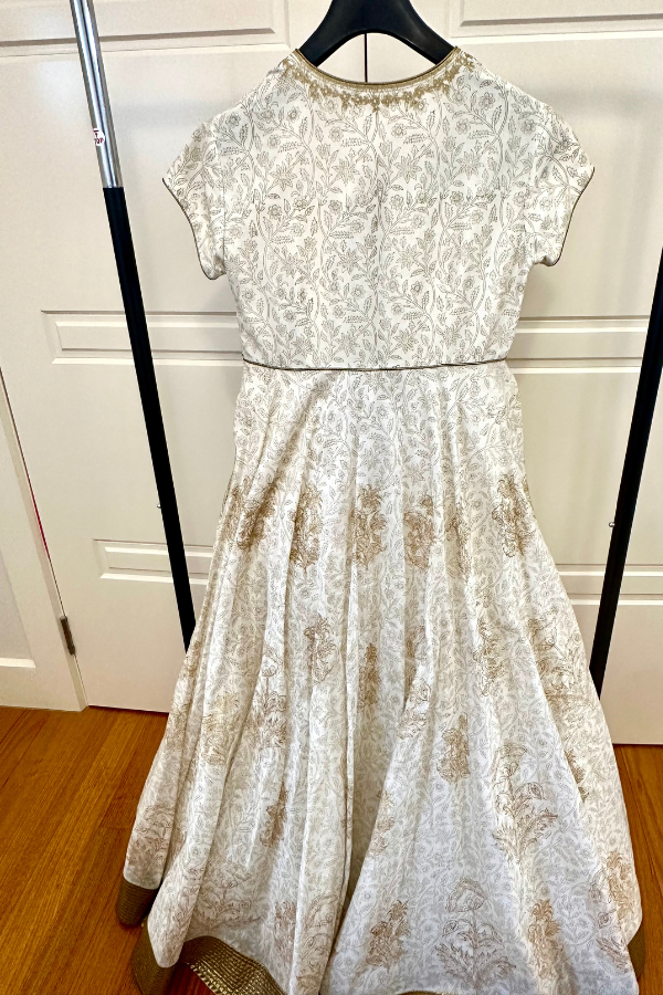 Description: Elegant Rohit Bal ivory Anarkali featuring intricate gold floral embroidery and a structured silhouette. Paired with a matching churidar and dupatta, this timeless ensemble blends regal charm with understated sophistication — perfect for festive or formal occasions.