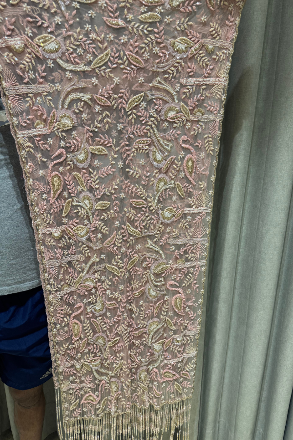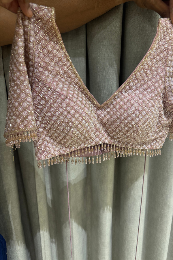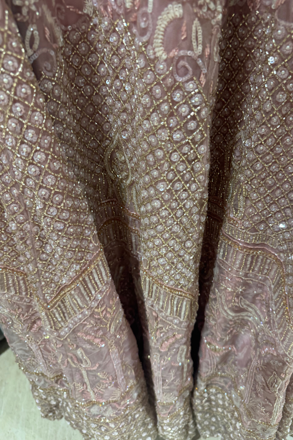 Description: A stunning blush pink bridal lehenga by Surabhi Chopra, intricately embellished with delicate thread, sequin, and bead embroidery. Paired with a matching blouse and dupatta, this ethereal ensemble exudes elegance and grace—perfect for a modern bride.
