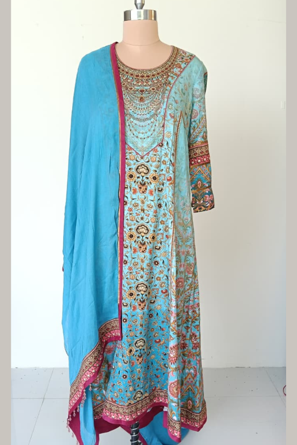 Description: Elegant Tarun Tahiliani aqua blue kurta set featuring intricate floral and paisley embroidery with maroon accents, paired with a matching dupatta and bottoms. A timeless ensemble blending tradition with sophistication.