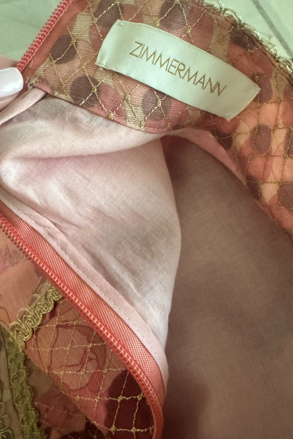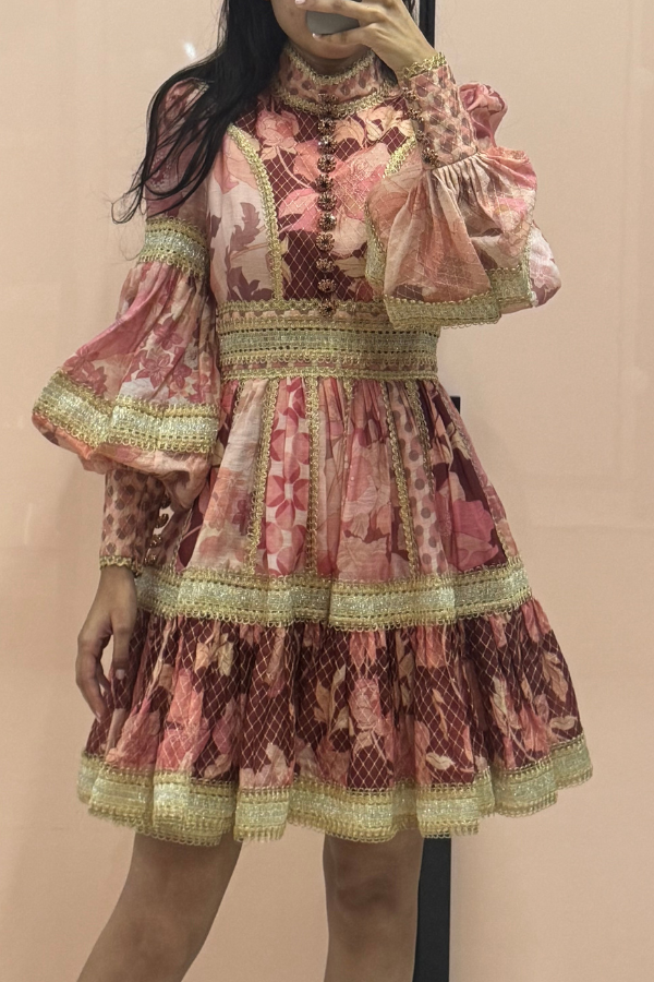Description: This exquisite mini dress features a romantic floral print in rich crimson and blush tones, crafted in sheer organza with gold lace trim and net detailing. Voluminous sleeves, a high neck, and layered skirt create a dramatic, feminine silhouette—perfect for statement occasions.