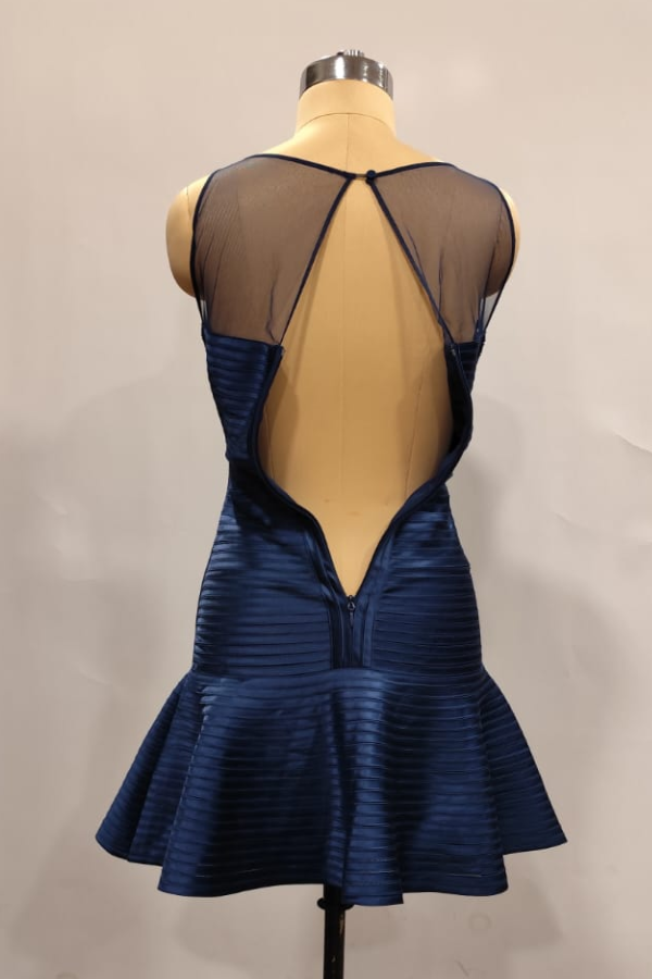 Description: This striking navy cocktail dress features a structured, pleated body with a flared hem and sheer illusion neckline. Its sleek texture and flattering silhouette make it a perfect pick for evening soirées or special occasions.