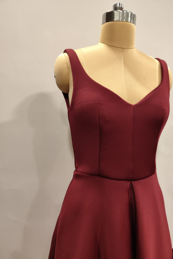 Description: A chic wine red dress by Gauri & Nainika, featuring a flattering fitted bodice, wide shoulder straps, and dramatic 3D floral appliqué details on the skirt for a statement-making finish.