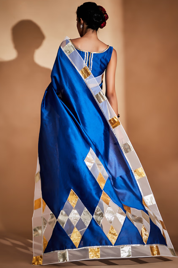 Description: A striking royal blue Chanderi silk saree by Gulabo by Abu Sandeep, featuring sheer white borders adorned with metallic gold and silver geometric accents. This graceful piece effortlessly blends traditional craftsmanship with contemporary design, making it perfect for festive occasions or elegant soirées.