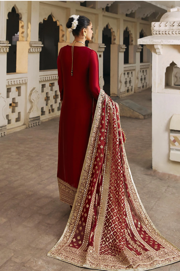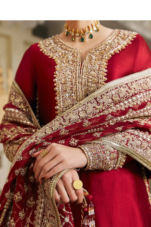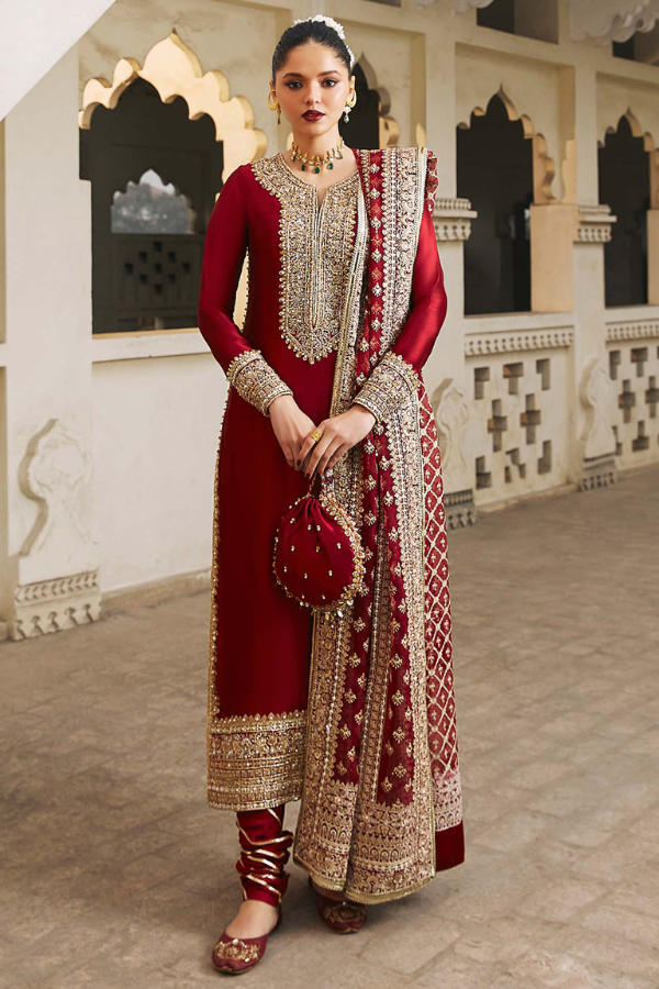Description: A regal deep red suit set by Kanwar Malik, adorned with intricate gold zari and thread embroidery. Paired with a richly embellished dupatta and churidar pants, this timeless ensemble exudes traditional elegance, perfect for weddings and grand celebrations.