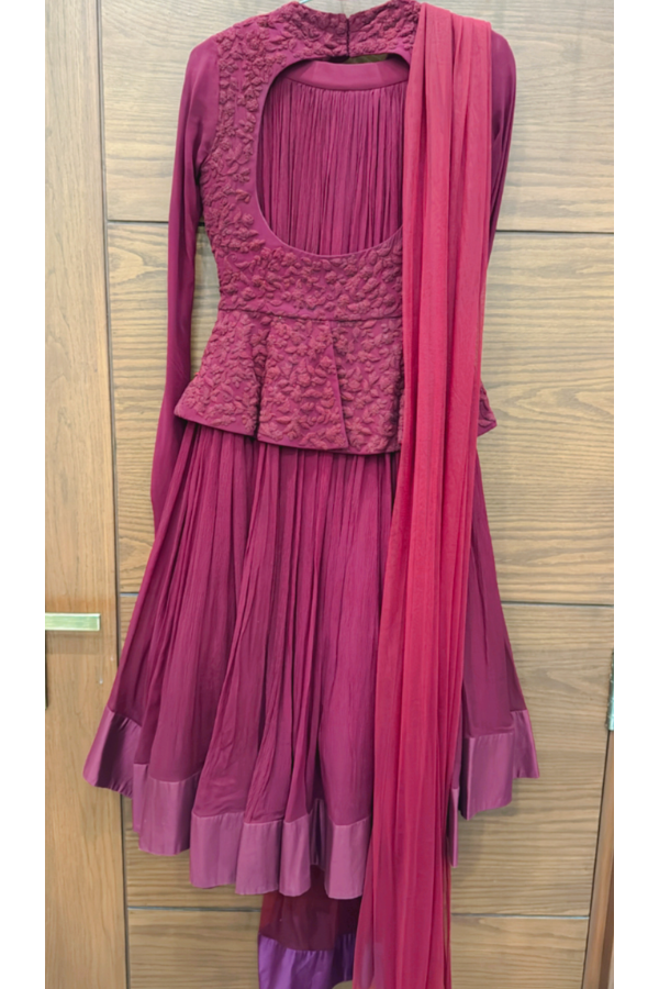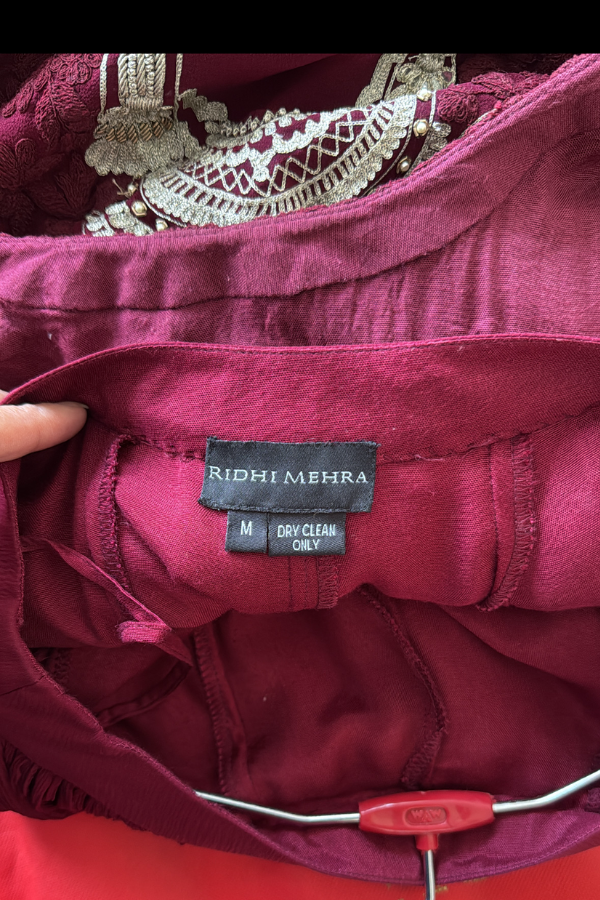 Description: A rich wine-hued ensemble by Ridhi Mehra, featuring a textured peplum-style top with intricate floral embroidery and signature mirror work detailing. Paired with a flowy pleated skirt and a soft matching dupatta, this set blends traditional elegance with contemporary flair.