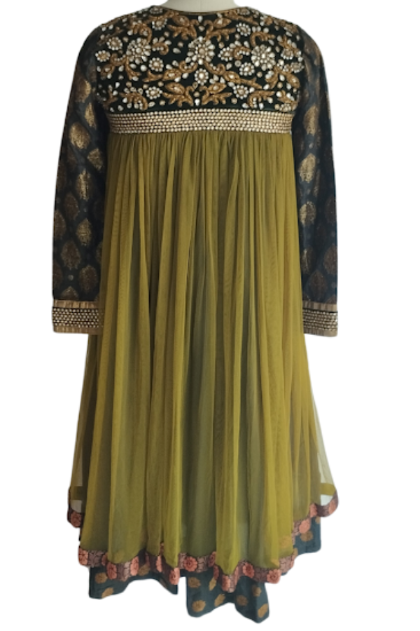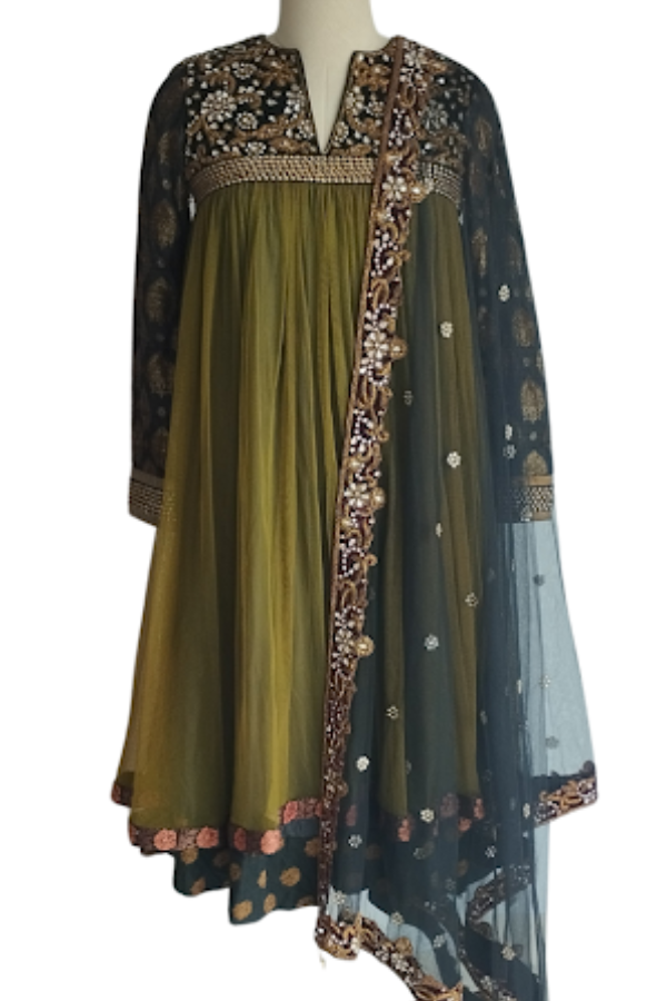 Description: The Vikram Phadnis green-black anarkali set exudes elegance and sophistication. This ensemble comprises a net anarkali paired with a georgette churidar and a net dupatta. The intricate detailing includes zardosi, beads, brocade, and dabka work, adding richness and texture to the outfit. This Vikram Phadnis creation is a beautiful choice for formal occasions or celebrations, combining classic craftsmanship with contemporary design elements for a truly glamorous look.