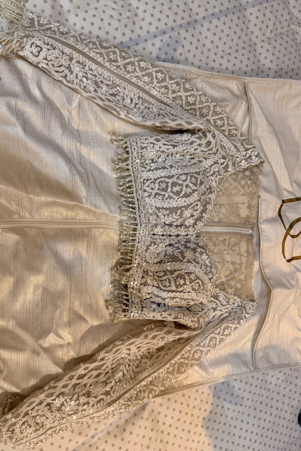 Description: An elegant champagne lehenga intricately embroidered with delicate threadwork and sequins, paired with a beautifully detailed blouse and a soft net dupatta. Perfect for engagement, reception, or day weddings, this timeless look blends grace with subtle shimmer.