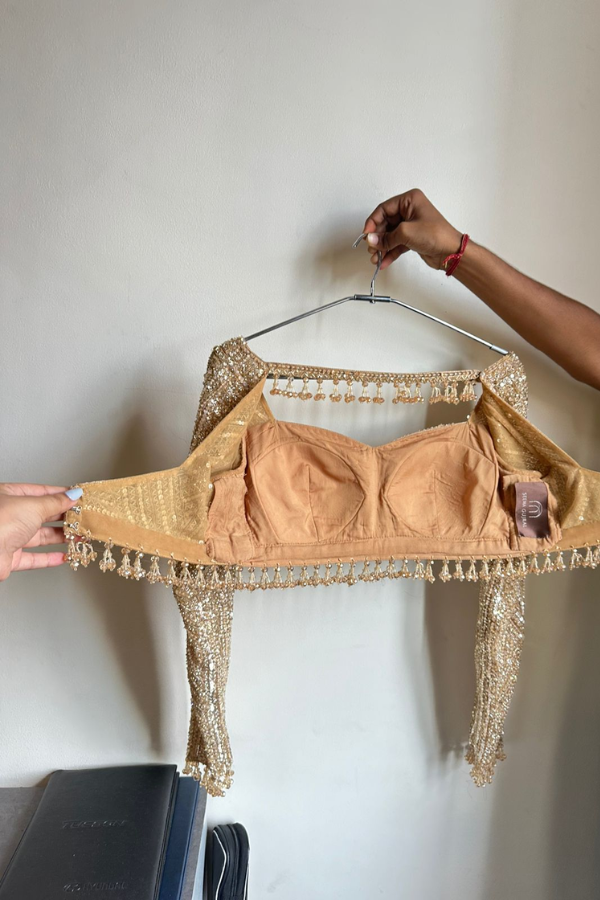 Description: This lehenga set features intricate embroidery in bugle beads, sequin and crystal in tones of gold. The ensemble is paired with a full sleeves blouse with tassels at the waist as well as at sleeve hem. It is paired with an embroidered net dupatta with tassels on all four sides.