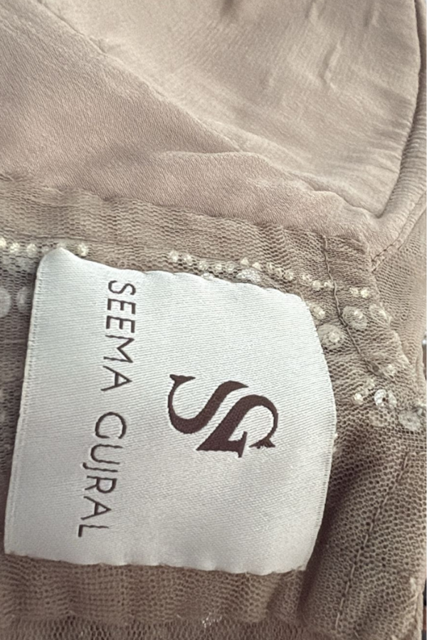 Description: A dazzling Seema Gujral gown featuring intricate silver sequin embellishments on a nude base. The sleeveless bodice is paired with a flattering V-neckline, while the flowy skirt adds grace and movement. The criss-cross back design lends a modern touch, making it a perfect pick for cocktail nights or glamorous receptions.