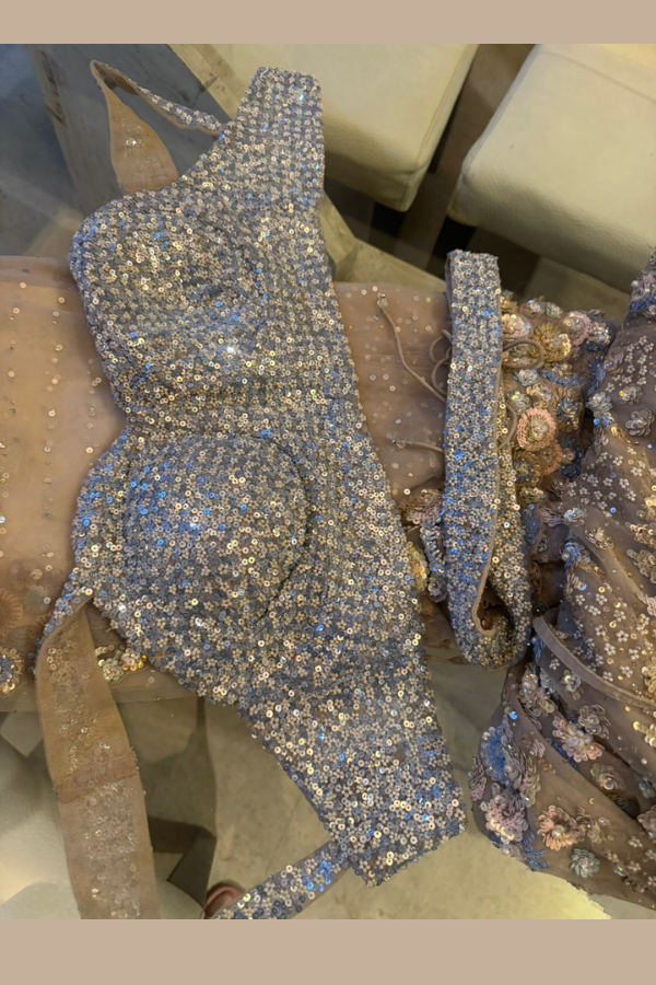 Description: A stunning Seema Gujral lehenga featuring intricate sequin and bead embroidery in icy blue and silver tones. The soft champagne base adds depth, while the shimmering floral motifs create a dreamy, ethereal look. Perfect for receptions, cocktails, or evening celebrations.